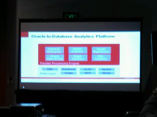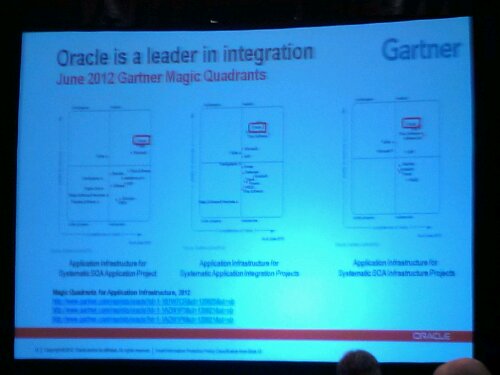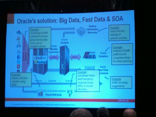 Lots of “cloud” talk from Oracle and its partners. CEO Larry E did a cool presentation or real-time analytics on 4.9 billion tweets gathered for the 5 days following the summer Olympic games. It was quite interesting to see the analysis of structured and unstructured data together in a drillable dashboard environment.